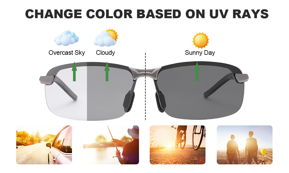 When the sun is intense, the lenses darken to cut glare; when you step into shade or the clouds roll in, they quickly brighten to keep your vision clear.
